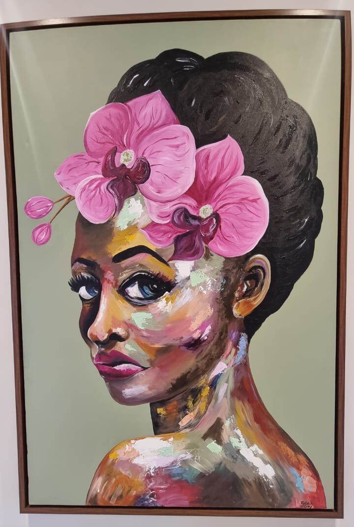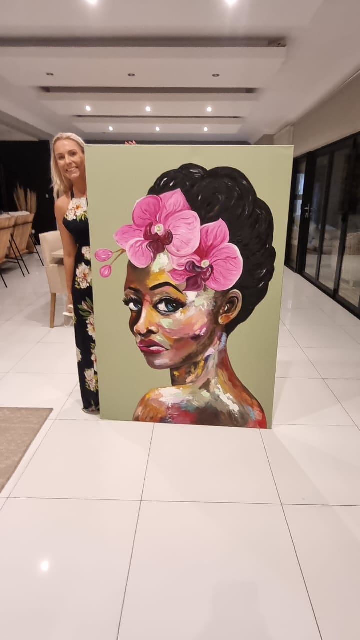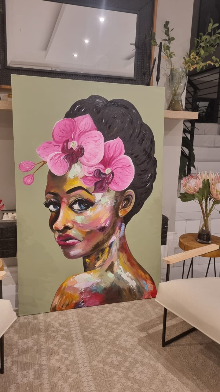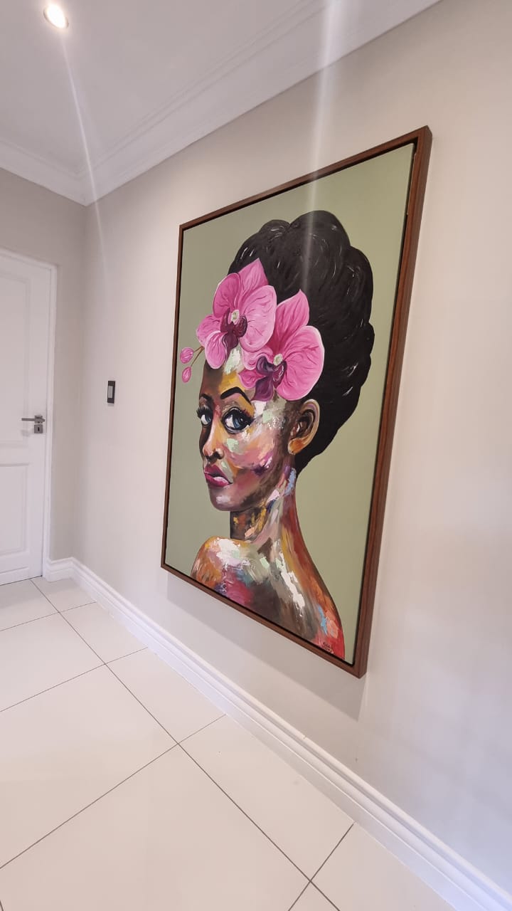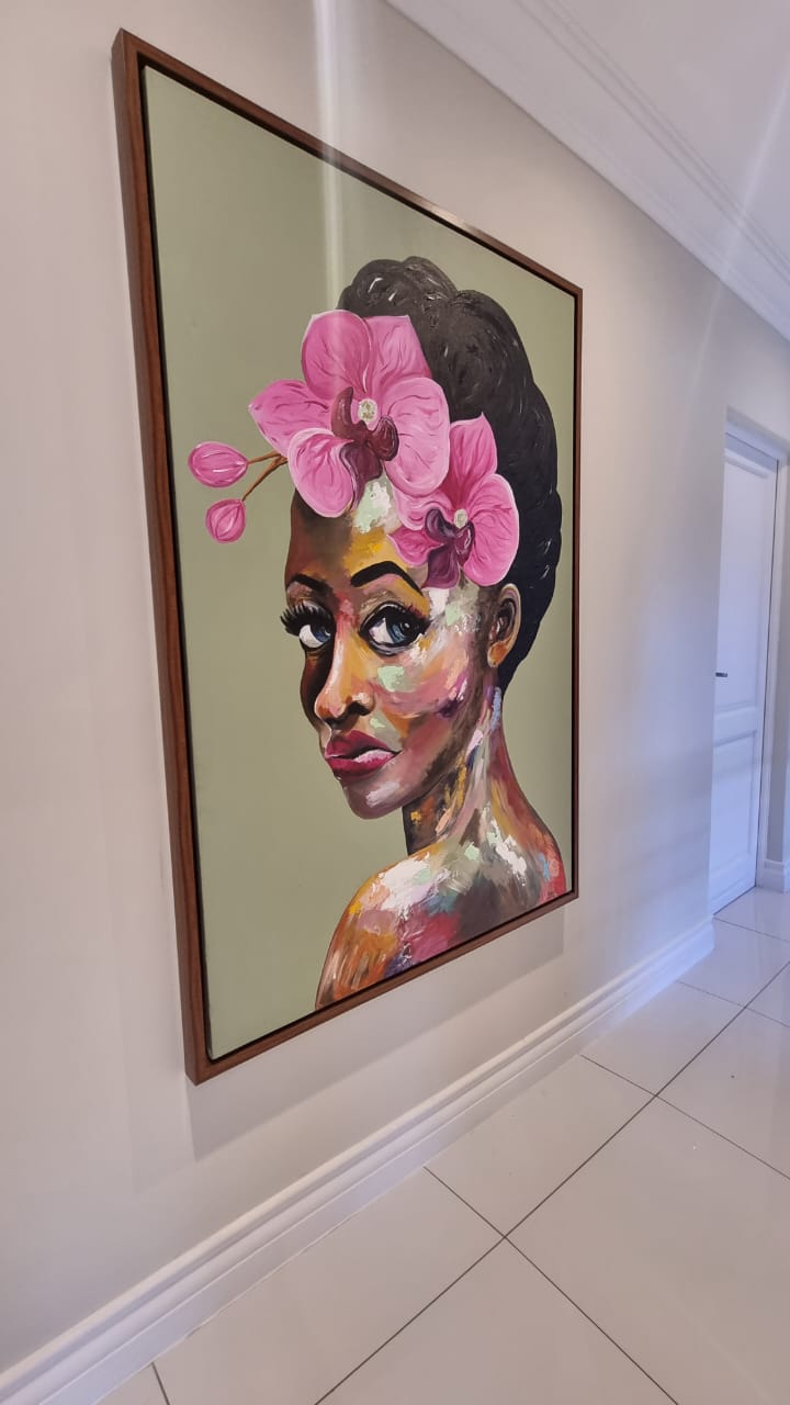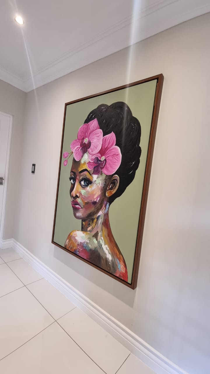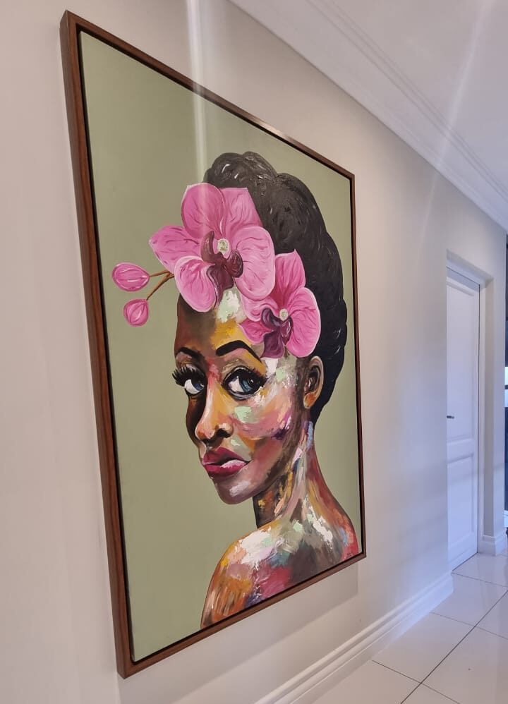 This large abstract painting of a beautiful women is captivating with it’s warm brown and natural tones yet also bright and colourful with a mix of pinks, yellows and greens. Lola will make any room come alive.