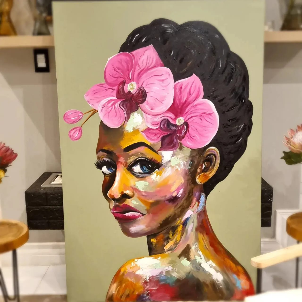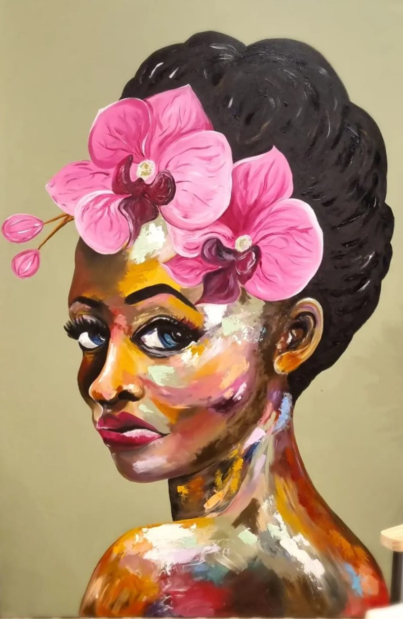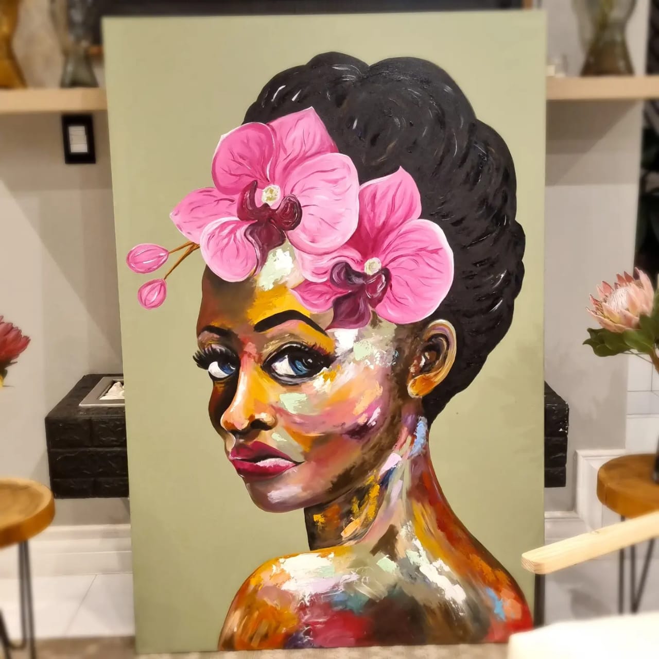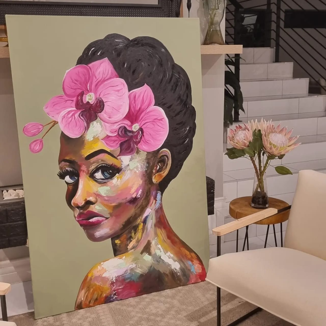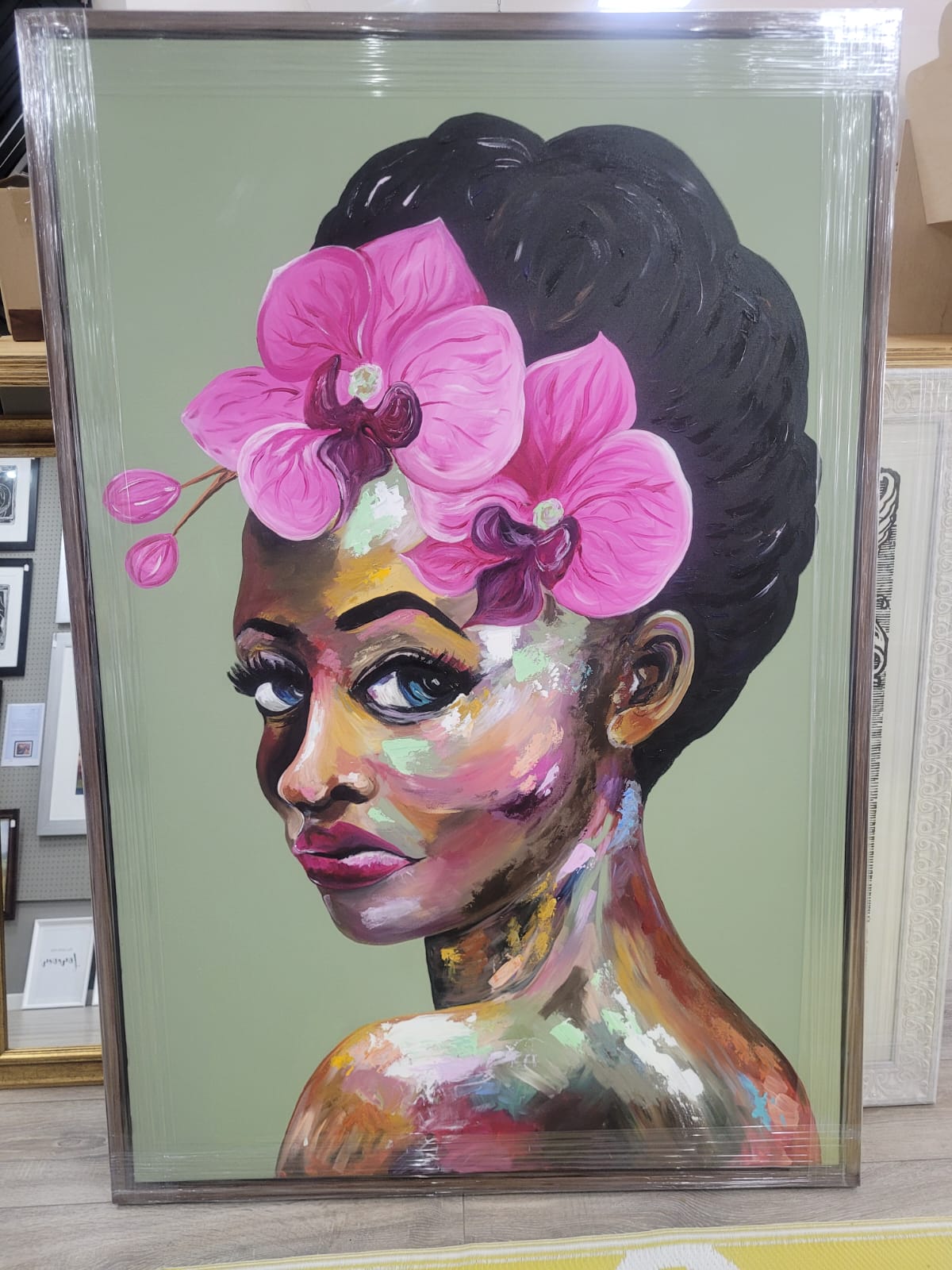 This large abstract painting of a beautiful women is captivating with it’s warm brown and natural tones yet also bright and colourful with a mix of pinks, yellows and greens. Lola will make any room come alive.
