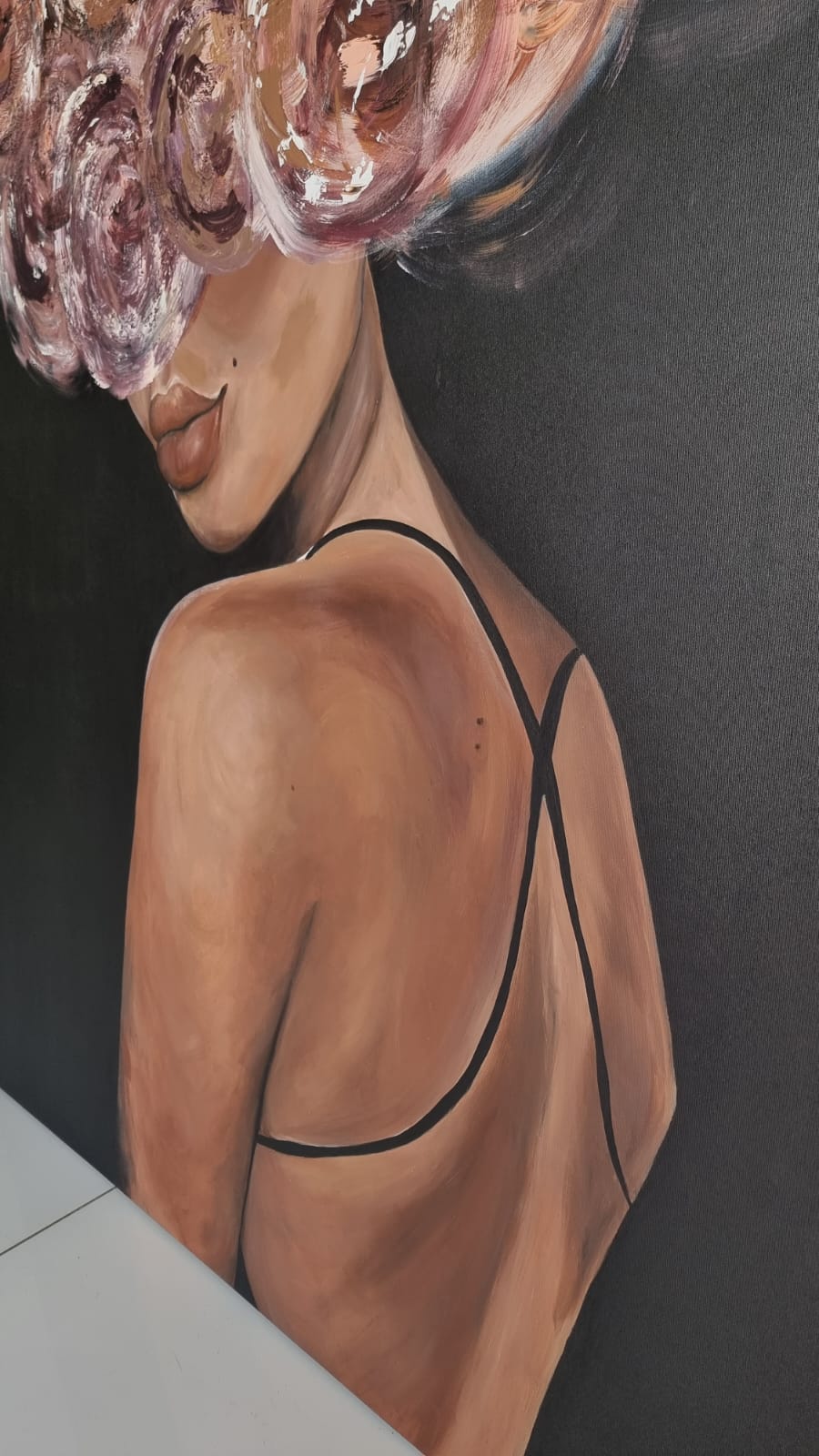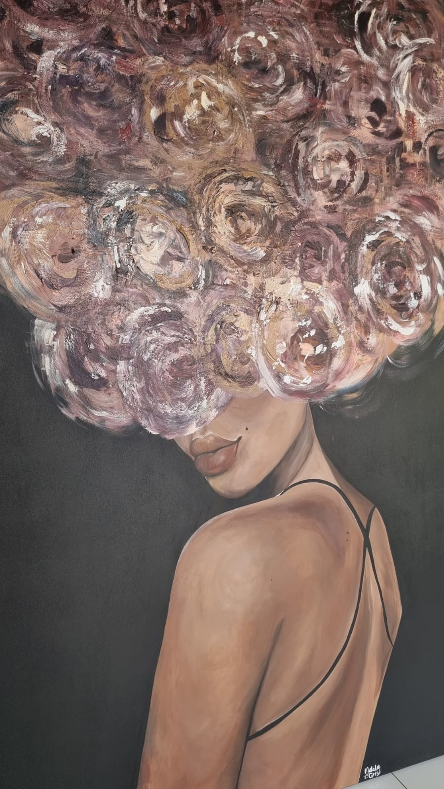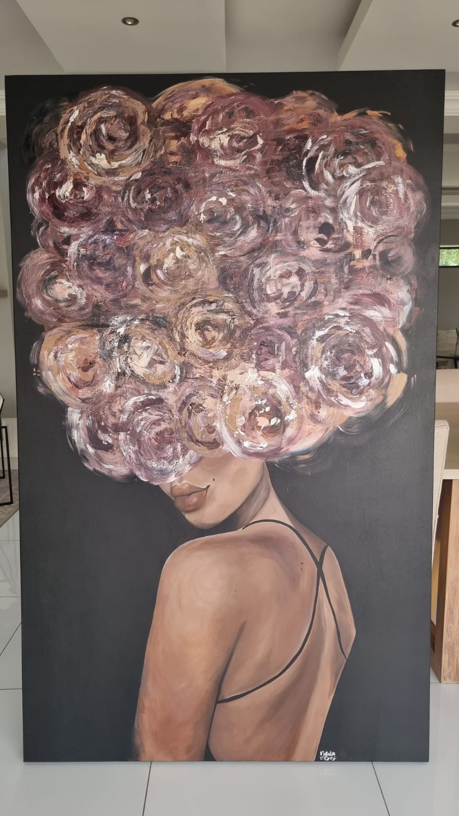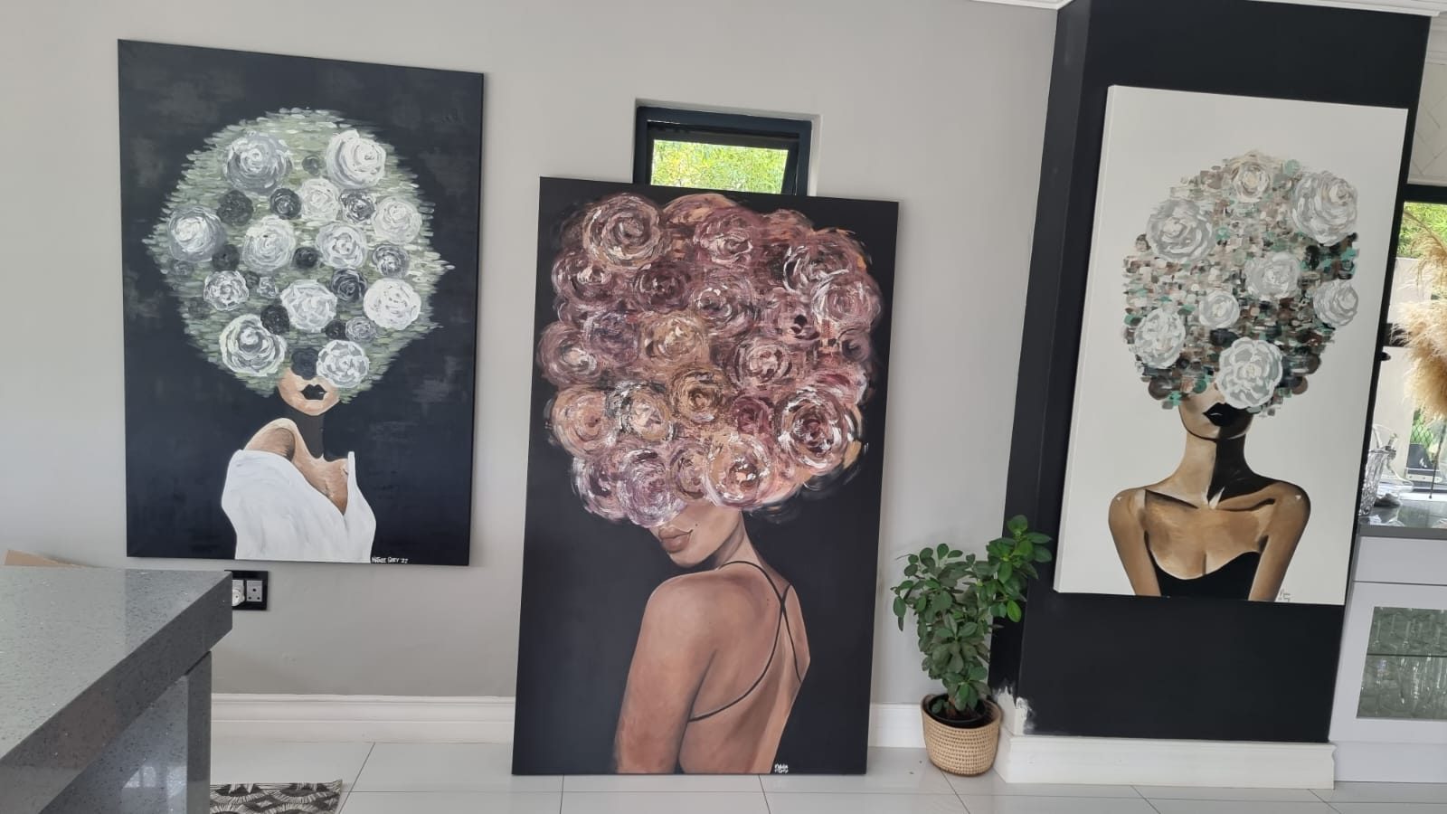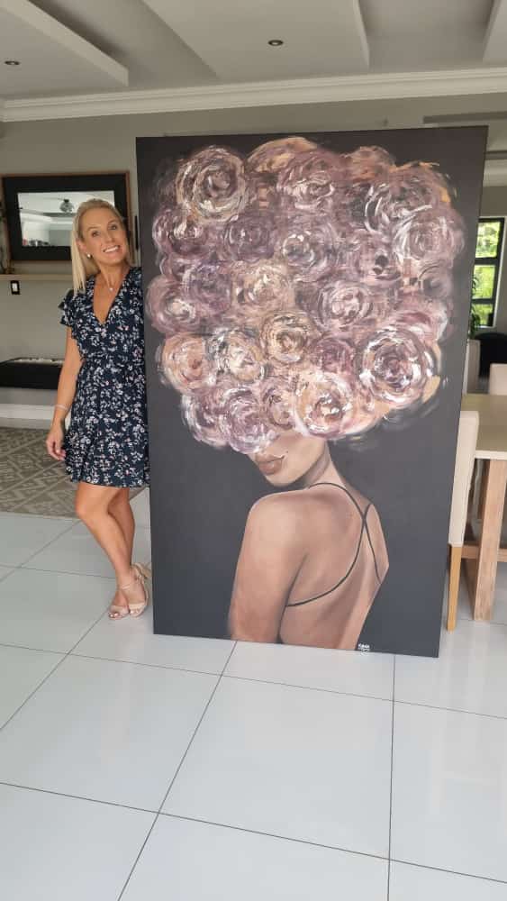 I named her after one of my favourite wines from Springfield Wine Estate. Although it’s a white wine it was actually inspired by my feeling and not the colour. I painted her over two days which were boiling hot. Last night I got out our jacuzzi and went to paint. I listen to all kinds of music while I paint. Last night at around 11pm while listening to Bob Marley I thought to myself, “Gosh, I would love a glass of wine right now.” Hahaha I did not have one and continued to paint until 2:17am this morning. Today mid paint session I had that same feeling, and again the time was not appropriate. So I went down to our wine cellar, grabbed a bottle of Miss Lucy to put in the fridge to have with dinner tonight and as I looked at the bottle I just knew this painting had to be called “Miss Lucy.”