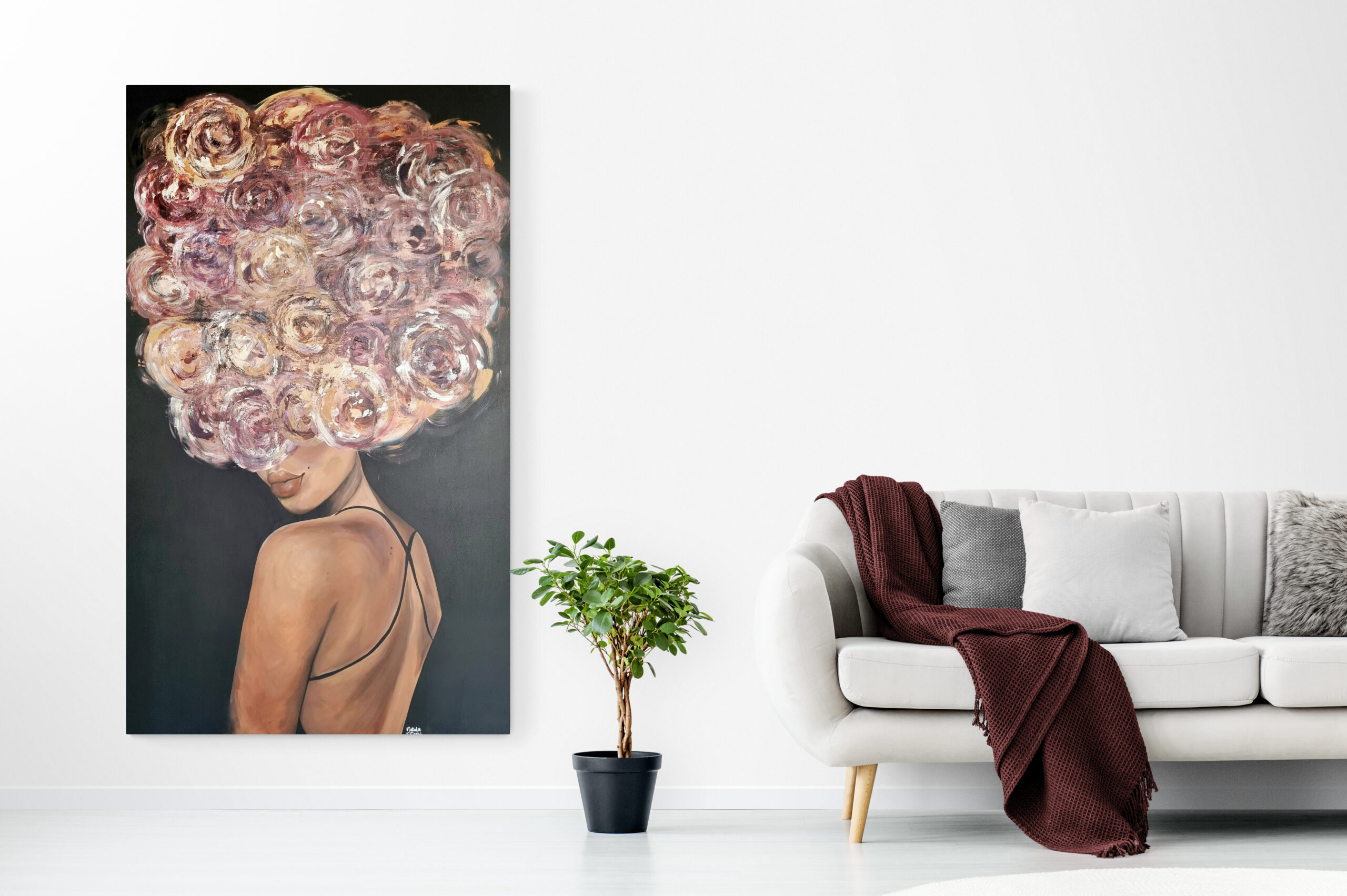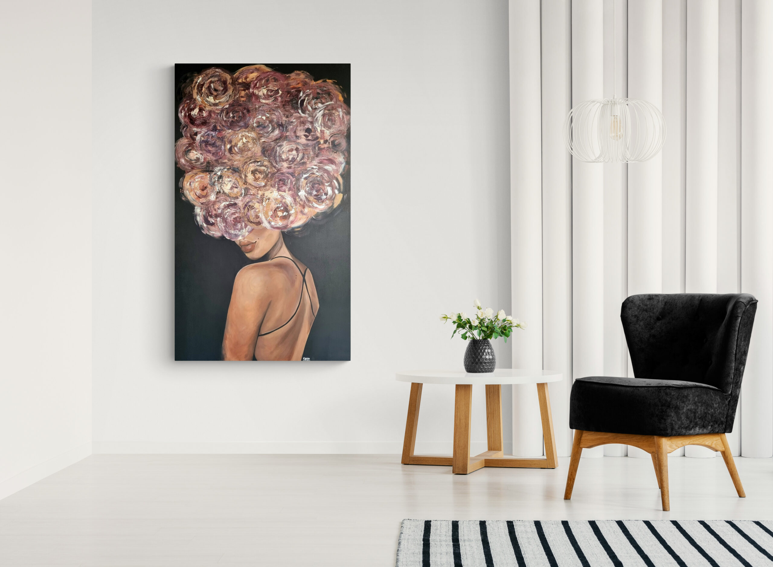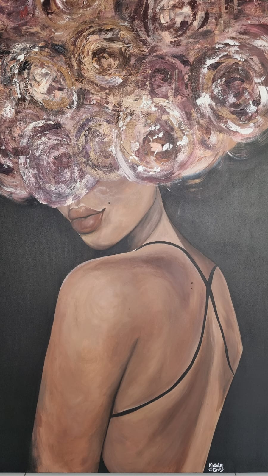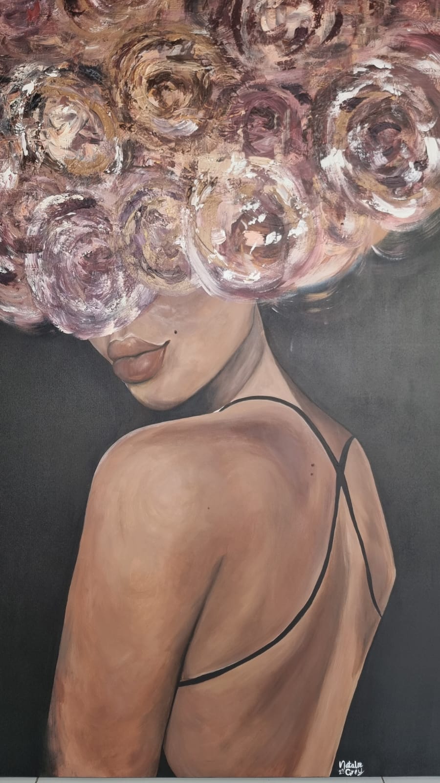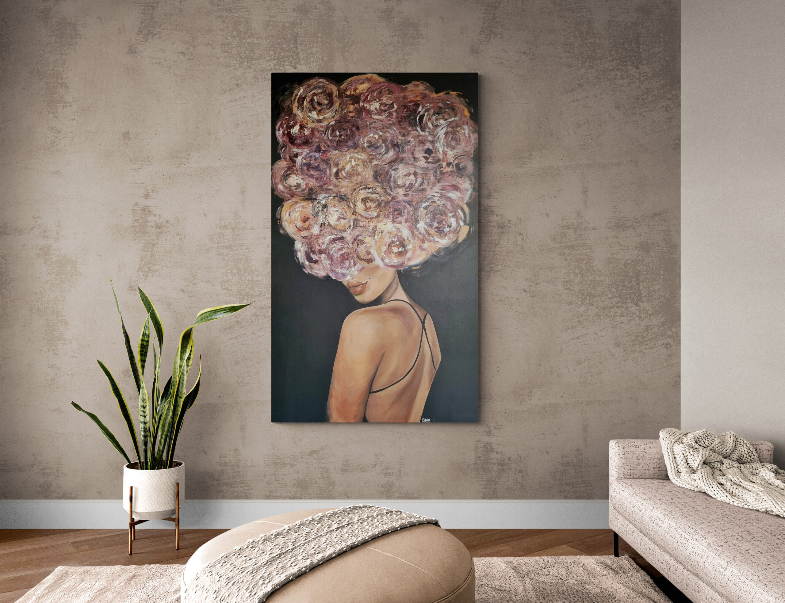 I named her after one of my favourite wines from Springfield Wine Estate. Although it’s a white wine it was actually inspired by my feeling and not the colour. I painted her over two days which were boiling hot. Last night I got out our jacuzzi and went to paint. I listen to all kinds of music while I paint. Last night at around 11pm while listening to Bob Marley I thought to myself, “Gosh, I would love a glass of wine right now.” Hahaha I did not have one and continued to paint until 2:17am this morning. Today mid paint session I had that same feeling, and again the time was not appropriate. So I went down to our wine cellar, grabbed a bottle of Miss Lucy to put in the fridge to have with dinner tonight and as I looked at the bottle I just knew this painting had to be called “Miss Lucy.”