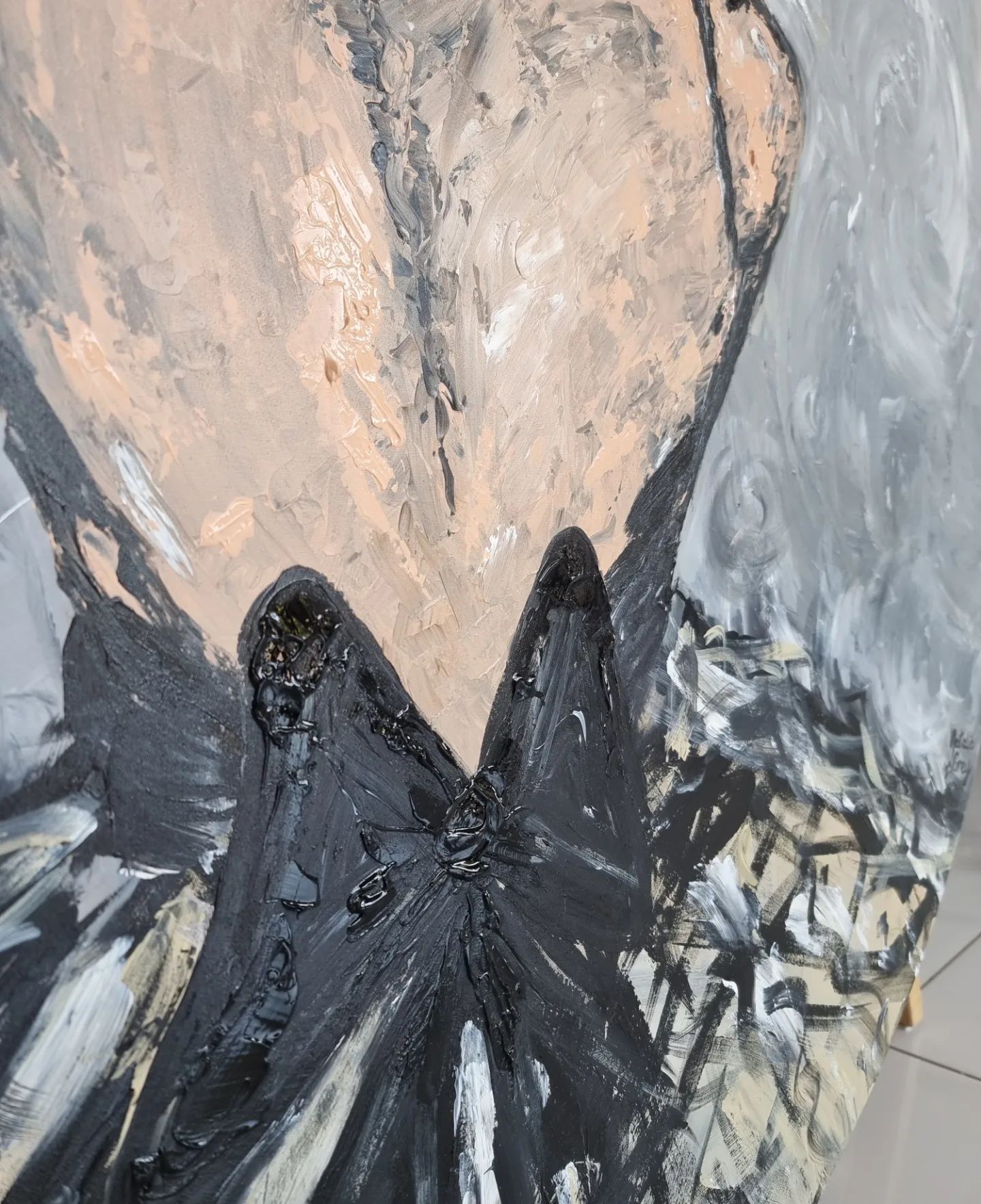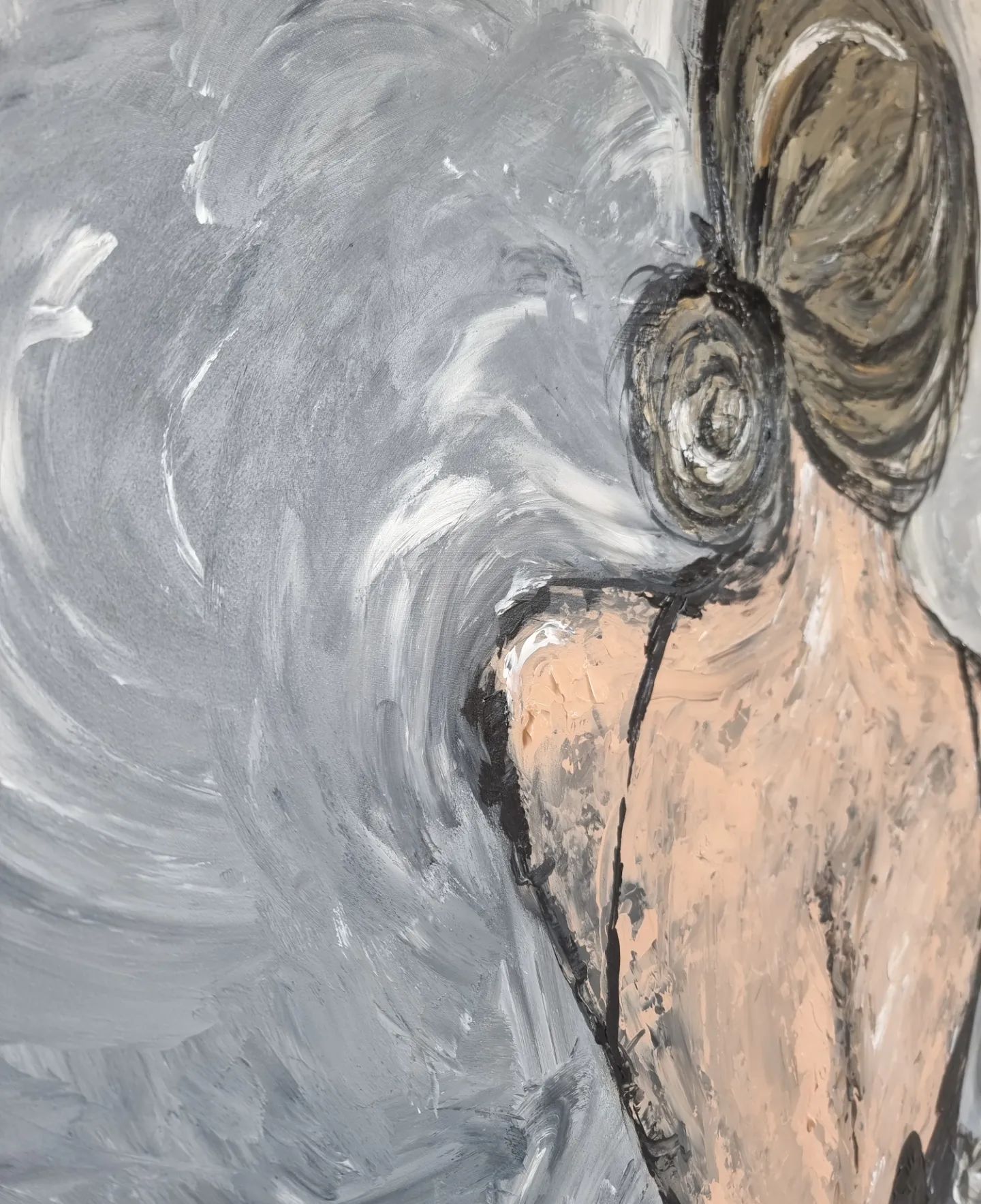 This morning I sat down in front of it. Painted the 3rd layer of skin and right at the end I just scribbled all over it and then scraped it off. I just started rolling the background and knew I wanted something light and pretty and elegant on this stunning canvas.